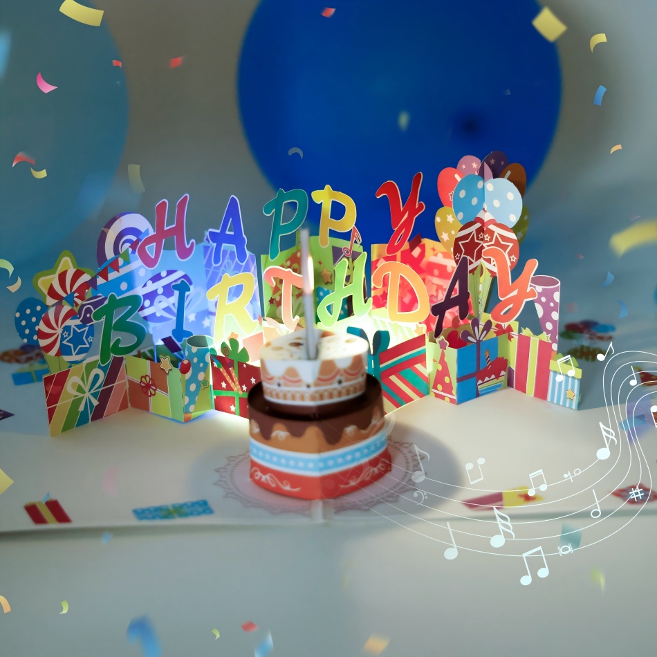 Festeggia i compleanni con una carta che porta emozione, colore e suono in un momento indimenticabile. Questo biglietto d'auguri pop-up 3D dal design accattivante si apre per rivelare una vivace scena di celebrazione piena di scritte in...
